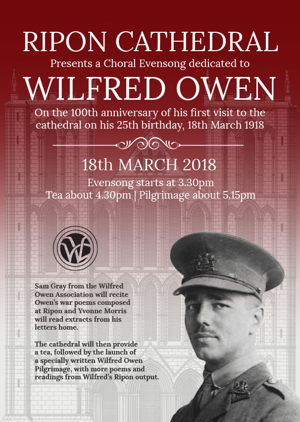 In place of a sermon, we will recite all the poems that Wilfred wrote in Ripon, March to June 1918, in front of the High Altar, which is also the city's memorial to all its citizens who fell in the Great War. There will be afternoon tea, courtesy of the cathedral, followed by a pilgrimage to the altar and sculpture in the north-west corner.