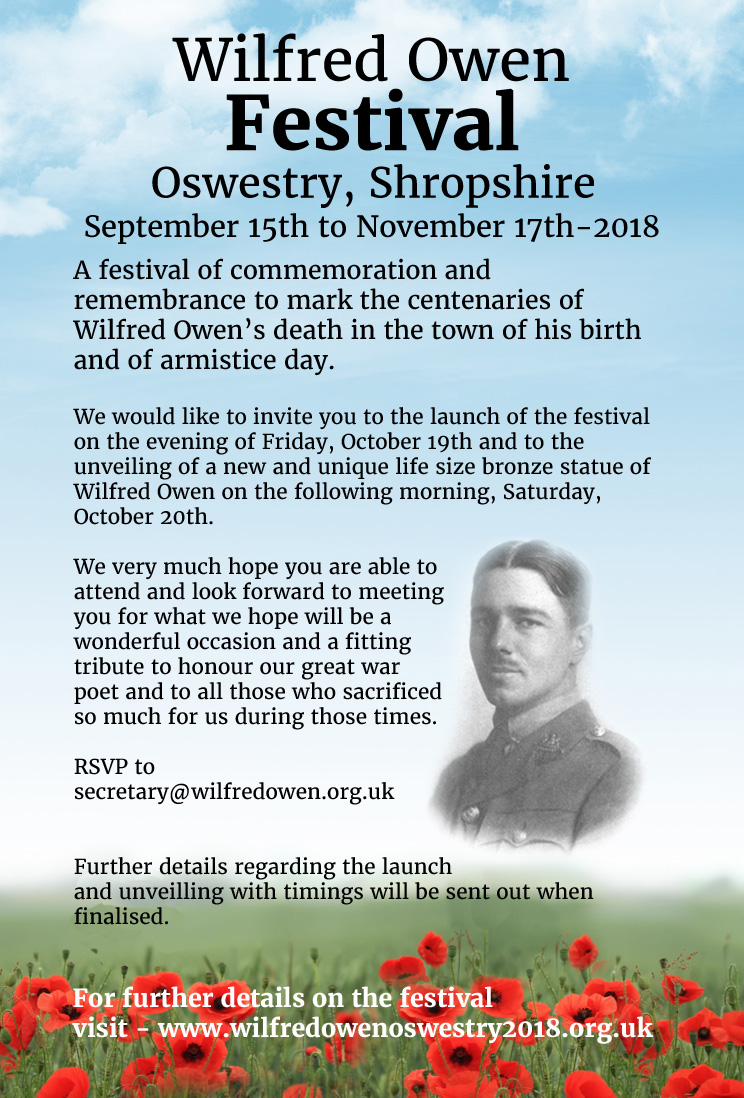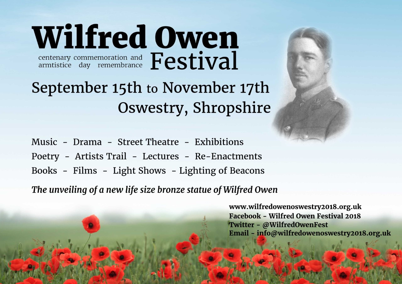 This page will be updated with news and events of the festival as we receive it. Visit the Wilfred Owen Festival website here. For further information, please contact info@wilfredowenoswestry2018.org.uk.